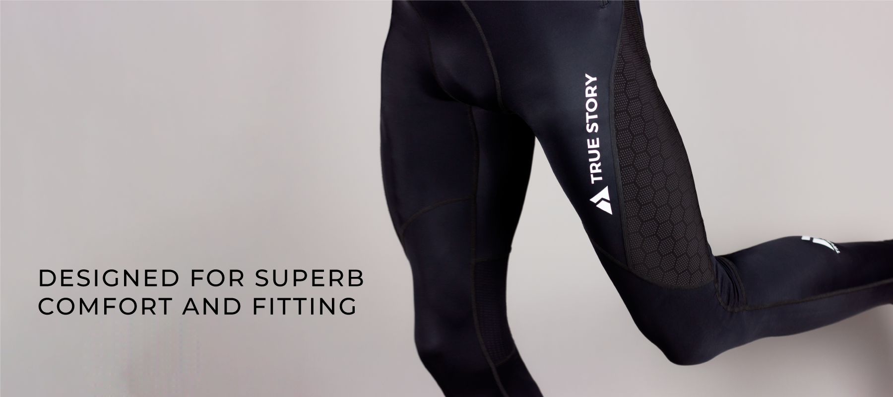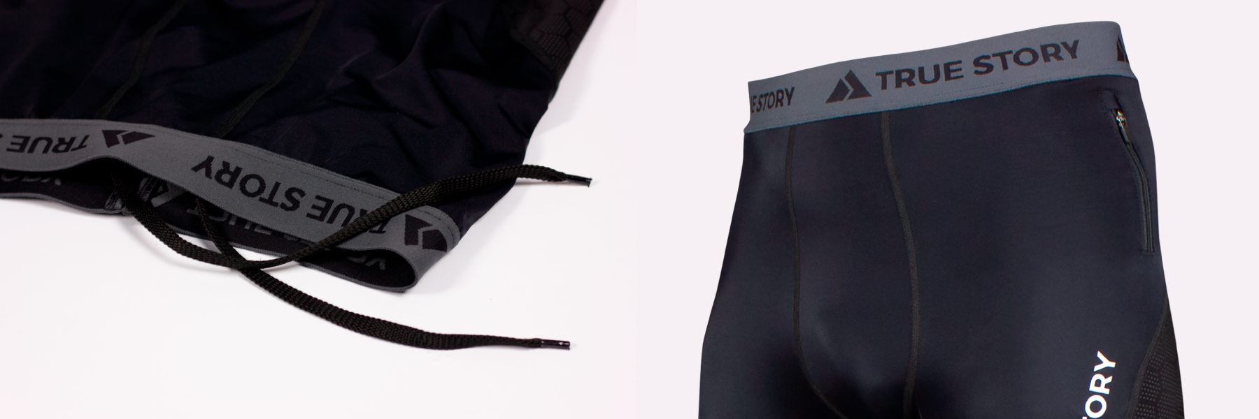 We created TRUE STORY PRO Running Tights for those who seek perfection in every detail. Durable lightweight lycra coupled with ceramic coated side panels, strategic cooling inserts behind knees and lower back. Features spacious back pocket for items like mobile phone and smaller side pocket that holds car keys at the reach. Both pockets come with semi auto-lock zippers. Wide TRUE STORY branded rubber band ensures great fitting around waist and you will find drawstring for extra safety. 85% on tights are made from 100% regenerated nylon