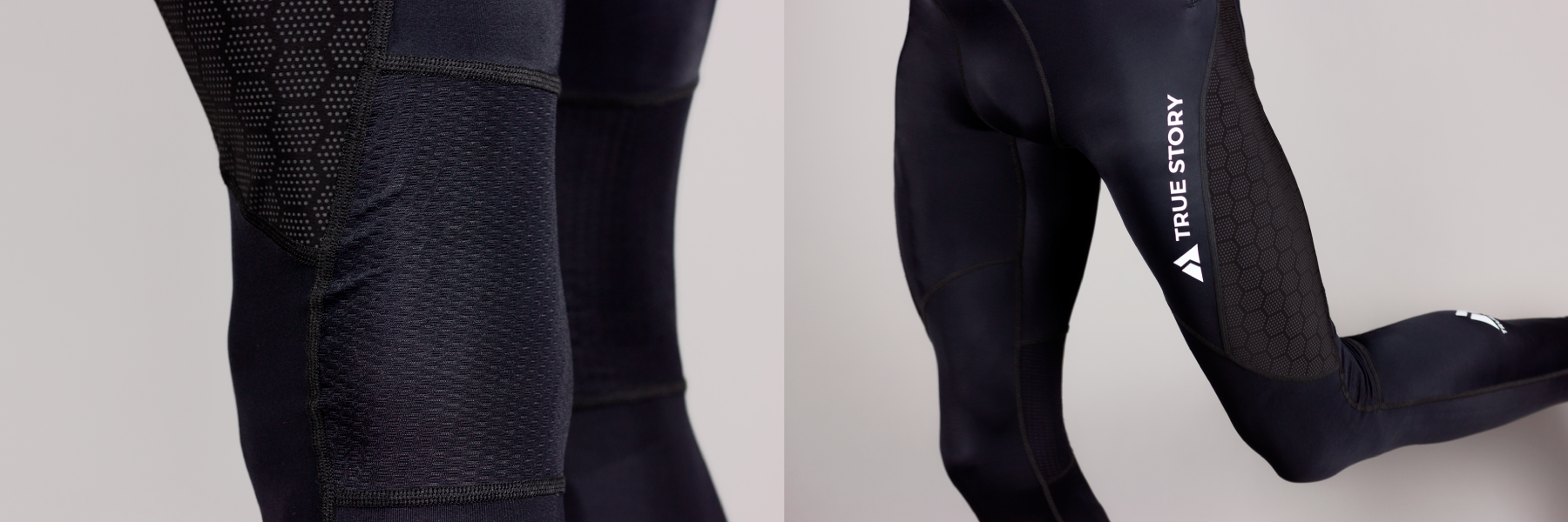 Vi skapade TRUE STORY PRO löpartights för dem som söker perfektion i varje detalj. Slitstark lätt lycra i kombination med keramiskt belagda sidopaneler, strategiska kylinsatser bakom knäna och nedre delen av ryggen. Har en rymlig bakficka för föremål som mobiltelefon och en mindre sidficka som håller bilnycklarna nära till hands. Båda fickorna kommer med semi auto-lock blixtlås. Breda TRUE STORY-märkta gummiband säkerställer bra passform runt midjan och du hittar dragsko för extra säkerhet. 85% på tights är gjorda av 100% regenererad nylon Econyl .